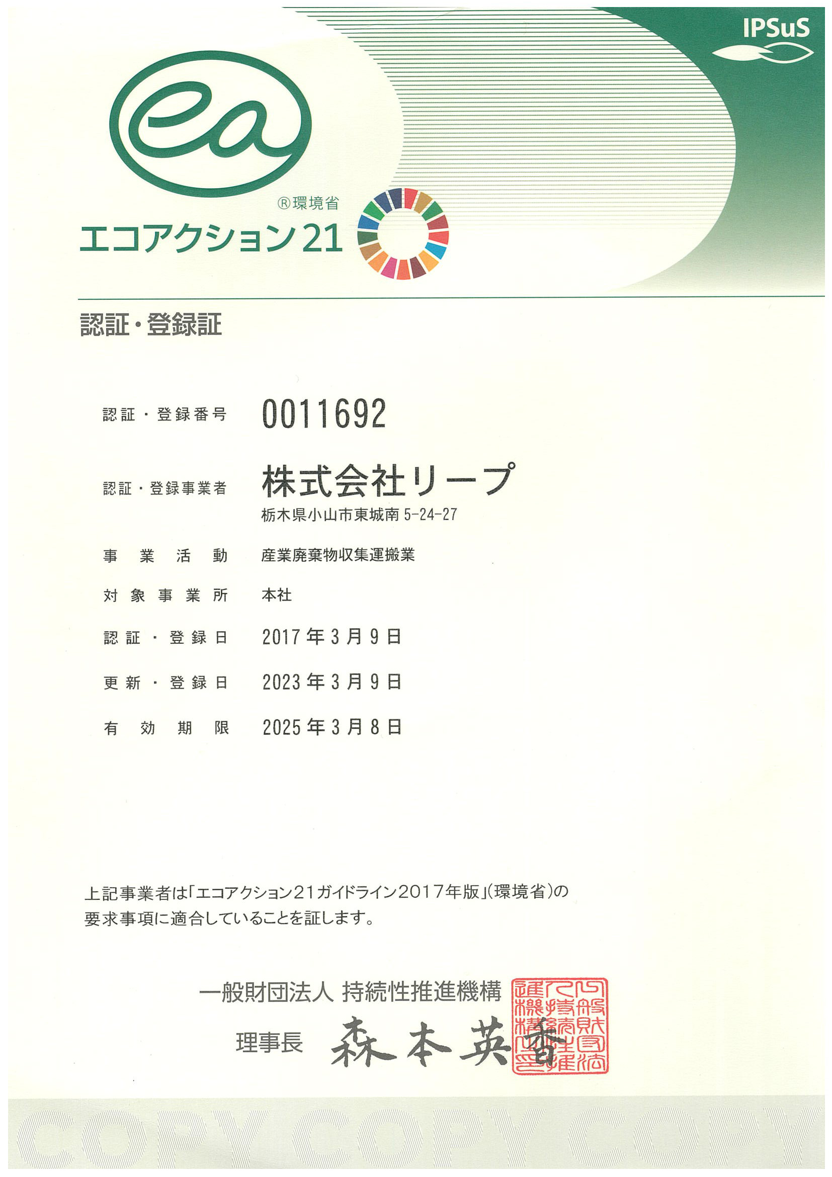| 平成25年10月 | 栃木県 産業廃棄物収集運搬業 許可取得 |